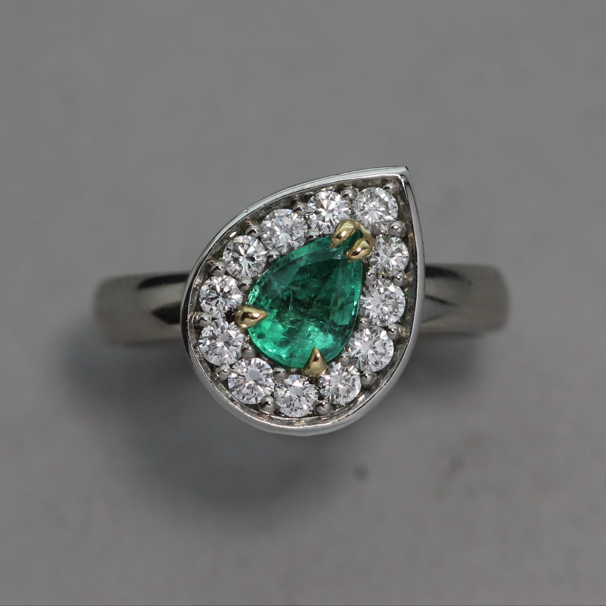 A Platinum Halo Ring featuring a 1ct Emerald and 0.4ct of G/VS diamonds. Claws in 18ct yellow gold.