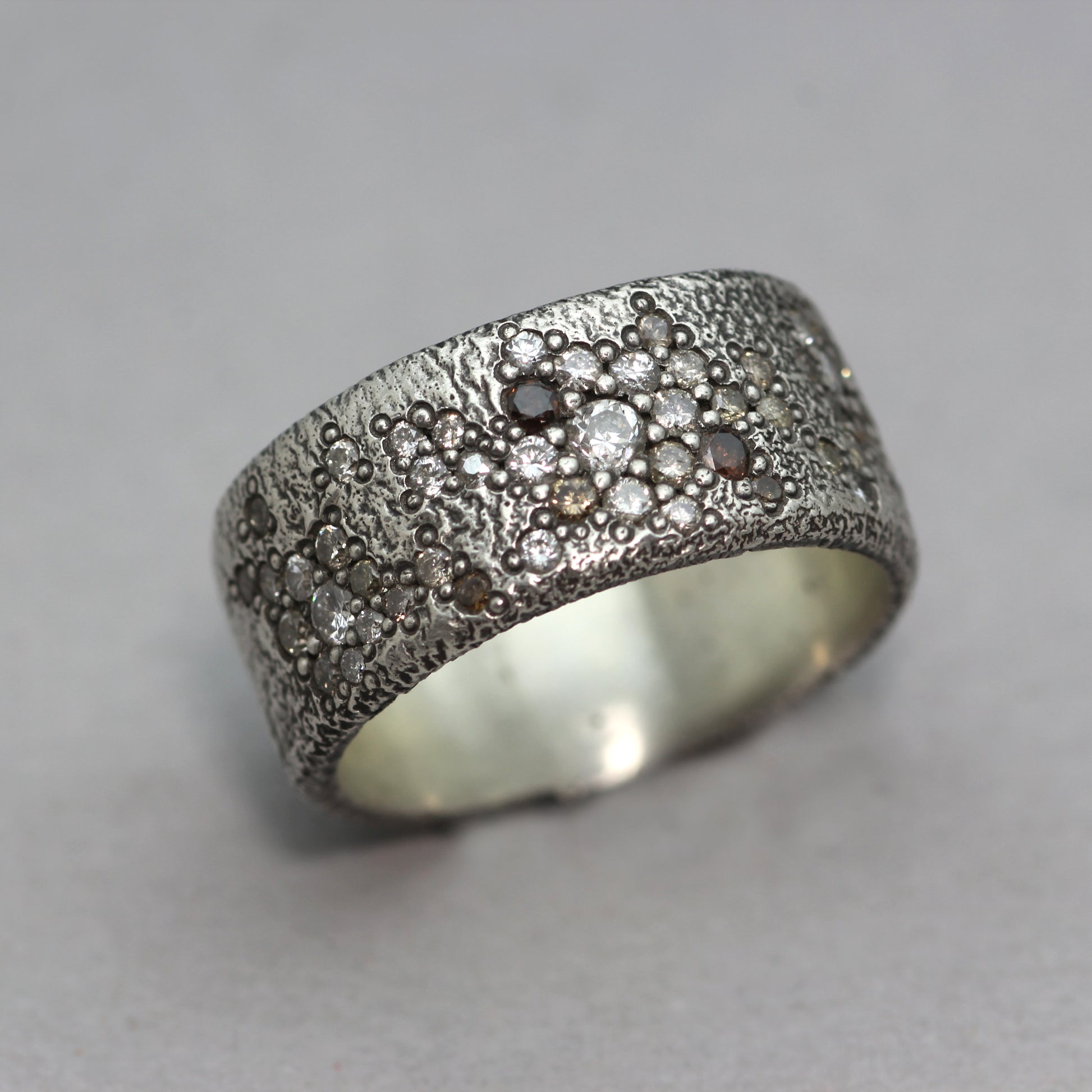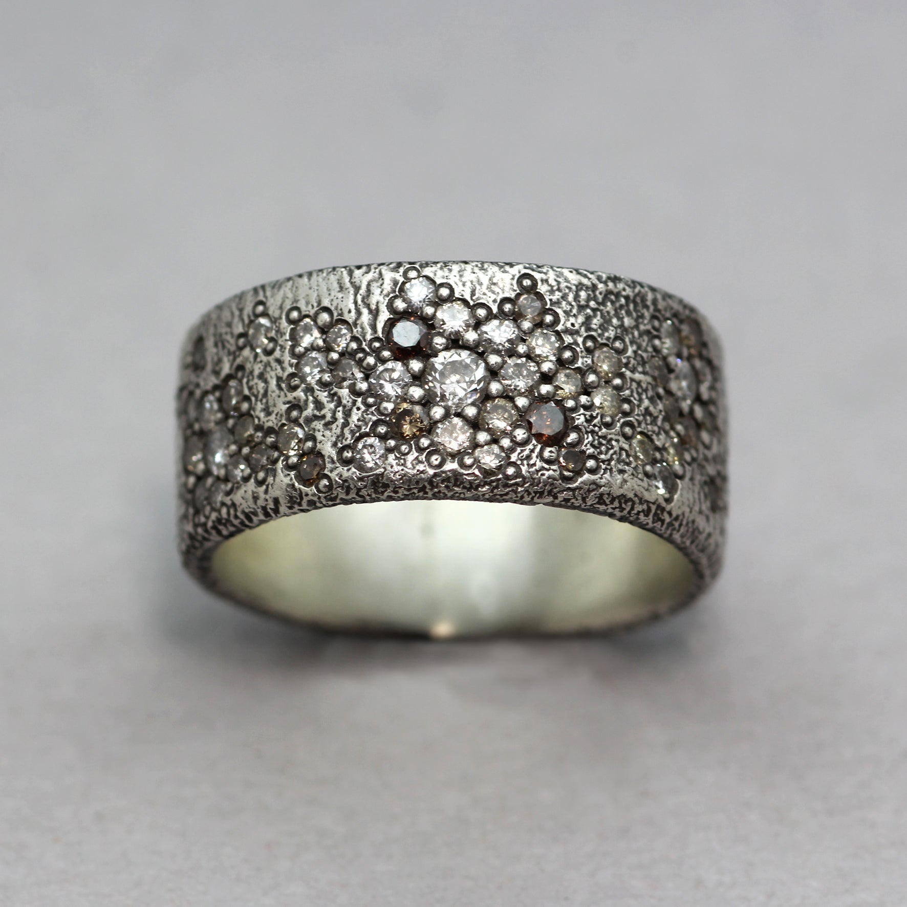 A silver reticulated band, encrusted with 1ct of mixed colours and shapes diamonds.